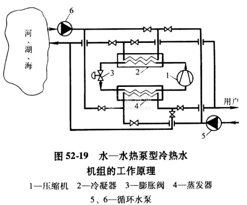 這種水熱源熱泵機組的工作原理見圖52-19。機組的運行性能穩定,COP值高。其工況的轉換比其他類型熱泵簡單,不需要改變制冷劑的流向,只要通過冷凍水和冷卻水管路閥門的切換即可。