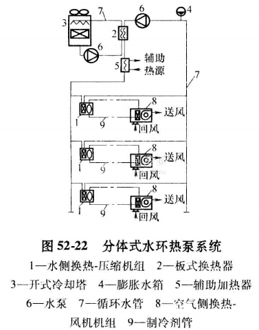 由于各種問題,整體式水環熱泵系統的應用在很大程度上受到了限制。近年來針對這些方面的缺點,各大設備制造廠都相繼開發出了分體式水一空氣熱泵式冷熱風機組,從而把它用于分體式水環熱泵系統,如圖52-22所示。