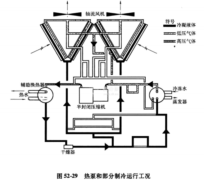 核心提示:圖52-29為熱泵和部分制冷運行工況,這是在用戶希望獲得盡可能多的熱量,同時又需要少部分供冷的情況。