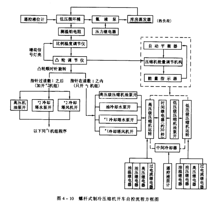 螺桿式制冷壓縮機(jī)自動控制在設(shè)計(jì)電路時(shí),要保證機(jī)器停車時(shí),能量調(diào)節(jié)裝置處在最小能量上,以滿足制冷壓縮機(jī)輕載啟動的要求。螺桿式制冷壓縮機(jī)的開機(jī)程序見圖4-10所示。其中壓縮機(jī)的能量調(diào)節(jié)由凸輪調(diào)節(jié)儀來控制。