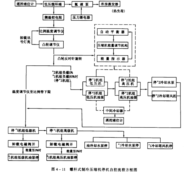 螺桿式制冷壓縮機(jī)的停機(jī)指令通常由溫度控制器(或壓力控制器)、手動指令及安全保護(hù)裝置發(fā)出,停機(jī)程序見圖4-11所示。