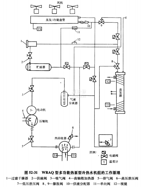 有一種多功能熱泵型冷熱水機組,可以意大利AIAX公司的W RAQ系列機組為例,其制冷劑循環和工作原理示于圖52-31。從該圖可看到,由于它比上述的AWHP型機組少了一組空氣換熱器,所以,其功能也相應地少了。但借助于相應電磁閥的切換,變換制冷劑的流向,也可實現以下多種工況: