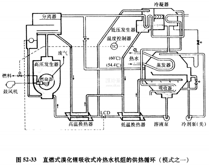 圖52-34所示的供熱循環代表第二種模式。此時機組增加一只輔助熱水換熱器。機組運行時,只需高溫發生器部分投入運行,其余部分均可靠閥門關斷隔開。這時,高溫發生器內產生的冷劑蒸汽,改接用于加熱熱水,釋放出熱量后生成的凝水,直接返回高溫發生器。由此可見,在此模式下作為吸收劑的溶液可不參加循環。