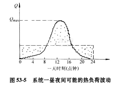 在絕大多數(shù)情況下,一個(gè)供熱系統(tǒng)的用熱量,在時(shí)間上總不會(huì)是均衡穩(wěn)定的,事實(shí)上這一負(fù)荷隨時(shí)間的波動(dòng)是相當(dāng)大的。圖53-5即表示這一狀況。假定一個(gè)供熱系統(tǒng)的鍋爐容量可以由晝夜間負(fù)荷圖來確定,例如:鍋爐房要滿足這種變動(dòng)負(fù)荷的要求,有兩種解決的途徑。一種是按量大的高峰負(fù)荷來確定鍋爐的容量。這時(shí),鍋爐只是在短暫的高峰負(fù)荷期間發(fā)揮全部能力,而在其余絕大多數(shù)時(shí)間里,鍋爐的容量總是程度不等地閑置著,這顯然是不經(jīng)濟(jì)的。另一種解決辦法是按晝夜間熱負(fù)荷的平均值來確定鍋爐的容量,并利用蓄熱器來達(dá)到均衡產(chǎn)熱,適時(shí)按需供熱。顯然,這后一種情況是經(jīng)濟(jì)合理的。