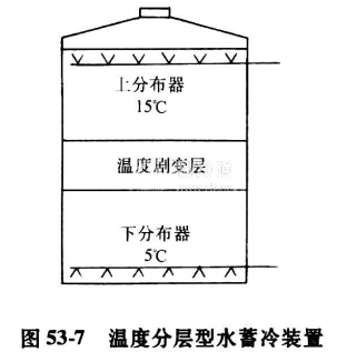 圖53一7所示的溫度分層型蓄冷水槽,即靠溫度劇變層將下部5℃的冷水與上部15℃的熱水分隔開來。從盡可能加大蓄冷容量的觀點(diǎn)看,溫度劇變層厚度應(yīng)保持愈小愈好,一般希望以不超過0.5m為度。實(shí)踐經(jīng)驗(yàn)表明,一個(gè)結(jié)構(gòu)設(shè)計(jì)合理、運(yùn)行良好的溫度分層型蓄冷水槽,其實(shí)際釋冷能力可達(dá)所蓄冷量的90%。