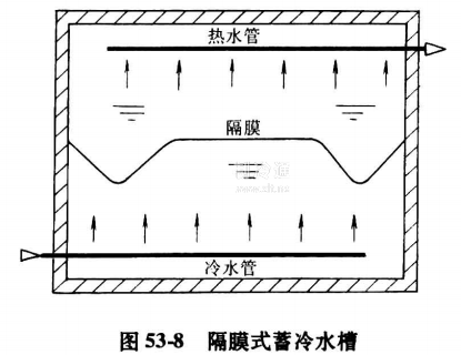隔膜式蓄冷水槽 其結(jié)構(gòu)如圖53-8所示,采用了一塊彈性薄膜,把熱水和冷水完全分隔開。當(dāng)蓄冷和釋冷時(shí),隔膜便隨著水流產(chǎn)生向上或向下的移動(dòng),從而相應(yīng)地改變冷水和熱水的容量。雖然隔膜可以完全避免混合損失,但卻不能消除冷熱水之間的傳熱損失。隔膜式蓄冷水槽的蓄冷特性可靠,但造價(jià)較高,維護(hù)工作量大。