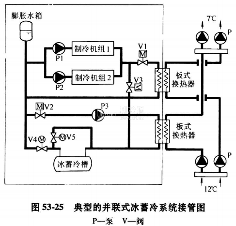 按照圖53-25,冷源側系統(tǒng)可很方便地實現(xiàn)四種基本的運行模式:制冰蓄冷、制冷機供冷、蓄冷槽供冷和制冷機與蓄冷槽聯(lián)合供冷。