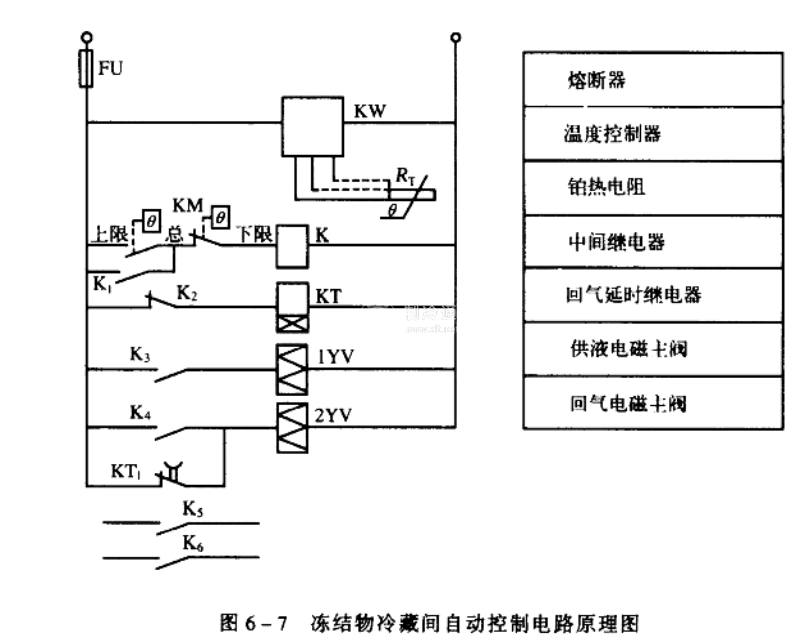 凍結物冷藏間的自動控制主要是庫溫的控制,由溫控器控制蒸發器上的供液和回氣電磁主閥實現。下面介紹TDW-12型溫度控制器對冷間進行溫度控制的電路。電路原理見圖6-7。