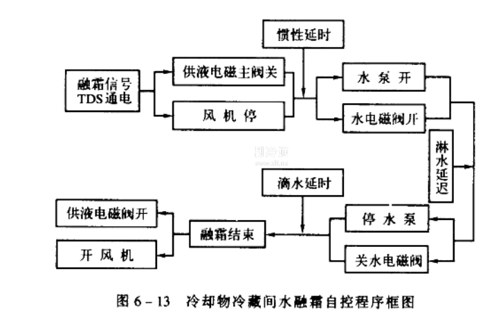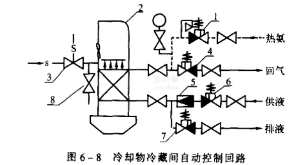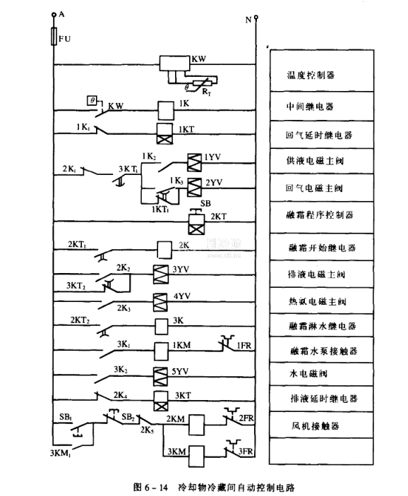 冷卻物冷藏間的控制回路見圖6-8所示。溫度控制采用WMZK-01型溫度指示控制儀。融霜控制采用TDS-05型時(shí)間程序控制器。其控制電路見圖6-14。