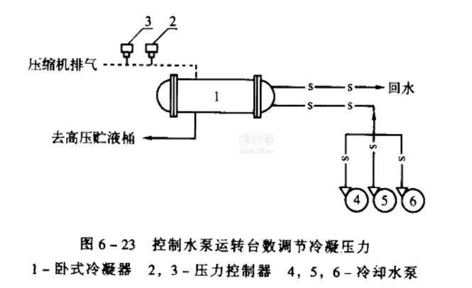 用控制水泵運(yùn)轉(zhuǎn)臺(tái)數(shù)的方法來調(diào)節(jié)冷凝壓力的原理見圖6-23。
