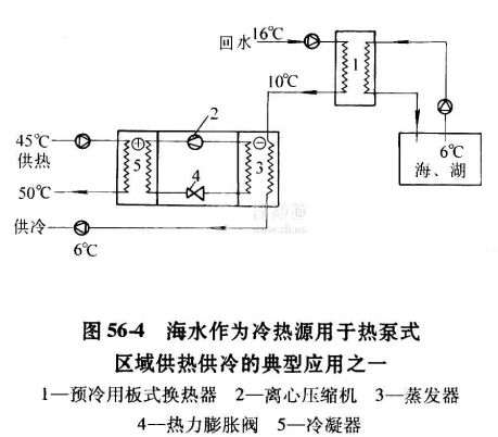 由于大海、大湖、大河在一定的深度下,其全年水溫受大氣溫度變化的影響較小,幾乎總是保持在一個相對較低的溫度水平。所以,把它作為制冷機的熱匯或水熱源熱泵的熱源,可說是最好不過的自然能源了。其典型的利用方式示于圖56-4和圖56-5。