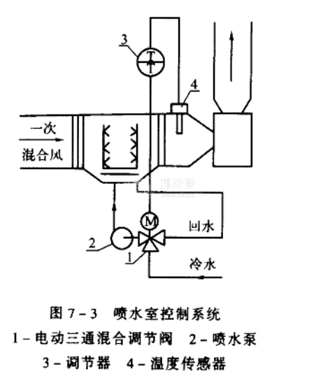 噴水室對(duì)空氣進(jìn)行噴淋,使空氣作多變過(guò)程控制,同時(shí)還對(duì)空氣有凈化作用。一般采用調(diào)節(jié)噴水溫度的辦法使空氣降溫、減焓。噴水溫度的調(diào)節(jié)采用電動(dòng)二通混合調(diào)節(jié)閥,以改變回水與冷水的混合比例來(lái)實(shí)現(xiàn)。其調(diào)節(jié)原理圖見(jiàn)圖7-3。