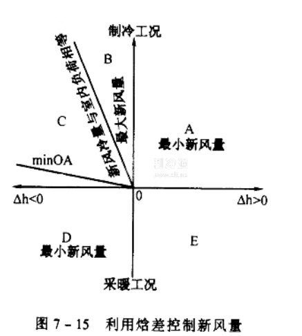 圖7-15是根據(jù)新、回風(fēng)焓差控制新風(fēng)量的分區(qū)圖。對新風(fēng)的利用,可以分為五個(gè)區(qū)。