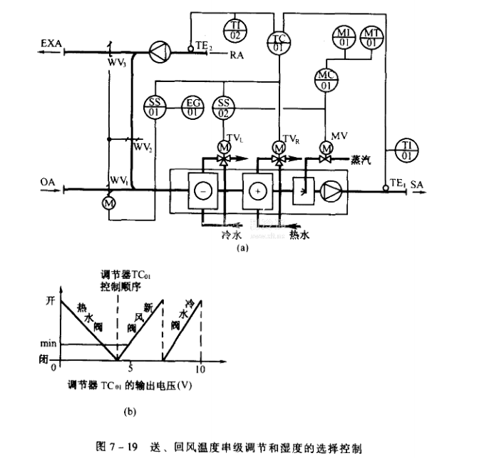 在圖7-19 (a)所示的自動調節系統中,送風溫度傳感器TE?和回風溫度傳感器TE?分別檢測空調系統中的送、回風溫度,并將其送到溫度調節器TC01,TC01以回風溫度為主參數,送風溫度為副參數,用回風溫度重調送風溫度給定值。TC01溫度調節器根據送、回風溫度按順序控制熱水調節閥TVR、新風閥wv?和冷水調節閥TVL,見圖7-19(b)。