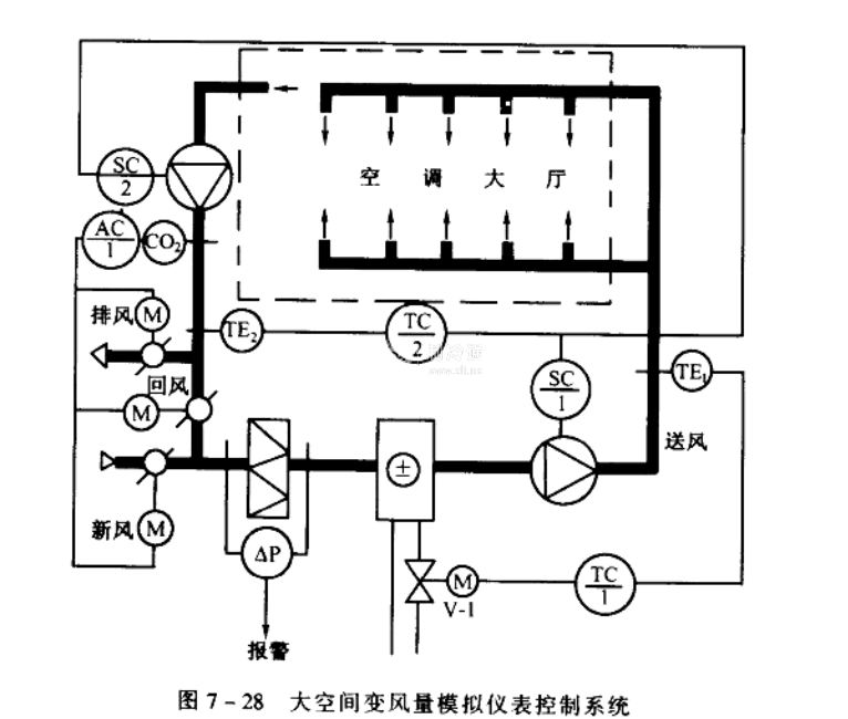 由一組空氣處理機給一單室大空間建筑物供風,可采用風機變頻調速,改變送風量,以補償室內冷(熱)負荷的變化。圖7-28是其自動控制的一例。