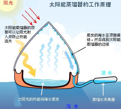 利用太陽能等可再生能源使海水或苦咸水淡化是實現淡水資源可持續供應的重要途徑。太陽能海水淡化領域的研究在中東、北非以及歐洲地中海地區非常活躍,美國、日本等國家也投人大量的人力物力進行淡化技術的開發示范等。太陽能海水淡化技術領域的研究主要集中在:①完全靠太陽能和環境條件白然變化驅動的被動式淡化水方法,如傳統的太陽能蒸餾池,多效太陽能蒸餾器等;②主動式淡化水方法,制備淡水需要少量的動力消耗,同時還要求配備風機、水泵等額外裝置,強化傳熱傳質效果,提高系統性能;③實現能源梯級利用,將上述技術與其他相關技術綜合應用的復合系統等,如和太陽能溫室相結合,與壓氣蒸餾以及閃蒸法等工藝相結合等。主動式海水淡化方法由于改善了淡化裝置的傳熱傳質效果,蒸發溫度和冷凝溫度可以分開調控,因而倍受重視。海水淡化過程中的能量、水分、鹽分回收,傳熱傳質過程的強化,部件中的結垢特性,能源利用效率和產水率的提高等是研究的重點。太陽能轉換利用關鍵主要是中低溫位的太陽能集熱器與蒸餾、閃蒸、壓氣蒸餾等工藝以及各種傳熱傳質過程相關的設備結合。