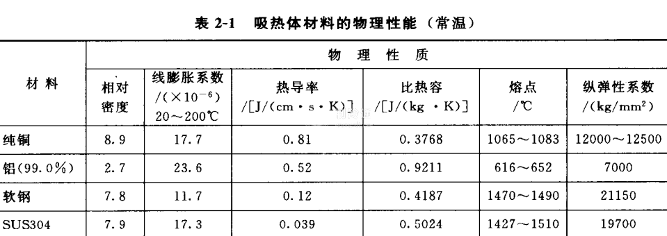 吸熱部件一般采用銅、鋁合金、銅鋁復(fù)合材料、不銹鋼以及鍍鋅鋼等,同時(shí)考慮載熱介質(zhì)流道與流體工質(zhì)的相容性,吸熱體多采用金屬材料,幾種主要吸熱體材料的物理性能見表2-1。吸熱部件的背面和側(cè)面材料一般采用發(fā)泡塑料、橡膠等保溫材料。