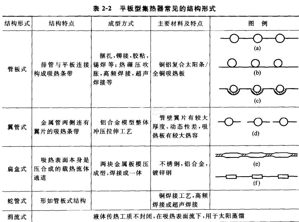 吸熱部件的結(jié)構(gòu)形式按照吸熱面板和載熱介質(zhì)流道之間的結(jié)合方式不同,可以分為管板式、翼管式、扁盒式、蛇管式和淚流式等幾種形式,見表2-2。
