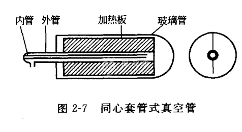同心套管式真空管(或稱直流式真空管)的外形跟熱管式真空管較為相似,只是在熱管的位置上用兩根內外相套的金屬管代替(見圖2-7)。工作時,冷水從內管進人真空管,被吸熱板加熱后,熱水通過外管流出。
