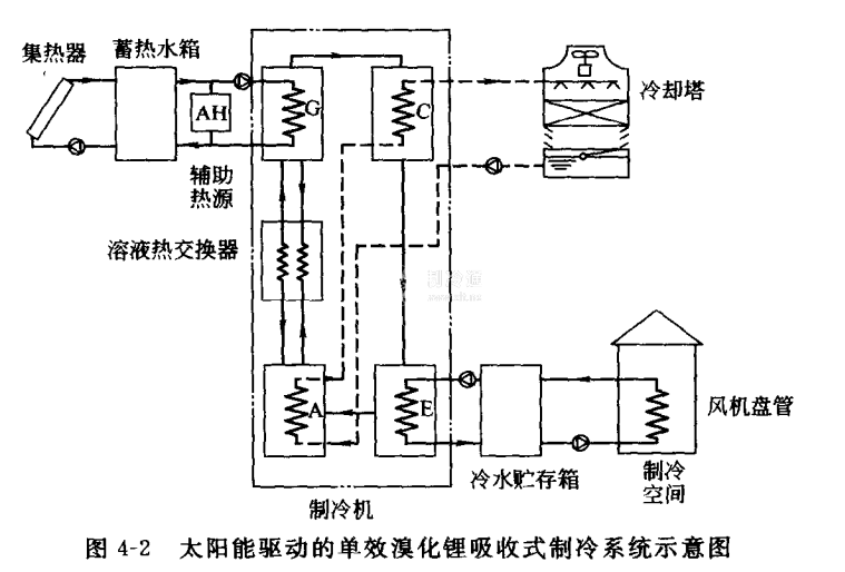 圖4-2所示是太陽能驅動的單效溴化鋰吸收式制冷系統的示意圖。