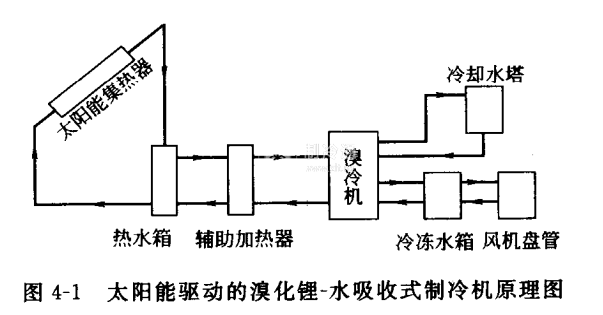 太陽能吸收式制冷,如圖4-1所示主要包括兩大部分:太陽能熱利用系統(tǒng)以及吸收式制冷機。太陽能熱利用系統(tǒng)包括太陽能收集、轉(zhuǎn)化以及貯存等構(gòu)件,其中最核心的部件是太陽能集熱器。適用于太陽能吸收式制冷領(lǐng)域的太陽能集熱器有平板集熱器、真空管集熱器、復(fù)合拋物面聚光集熱器、以及拋物面槽式等線聚焦集熱器。