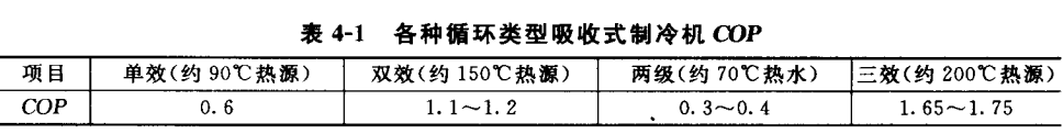 單效、兩級制冷機,熱力系數(shù)較低,三效乃至四效等更復(fù)雜的制冷循環(huán)機型,仍處于試驗研究階段,目前在市場上應(yīng)用最廣泛的是雙效型機組。但是由于雙效制冷機的能源利用率仍然不及傳統(tǒng)的蒸氣壓縮式制冷機,而三效制冷機由于COP值較高,能源利用率已經(jīng)可以超過傳統(tǒng)的蒸氣壓縮式制冷機,因此三效以及多效機組將是今后吸收式制冷技術(shù)發(fā)展的一個重要方向。各種循環(huán)類型溴化鋰-水吸收式制冷機的COP見表4-1。