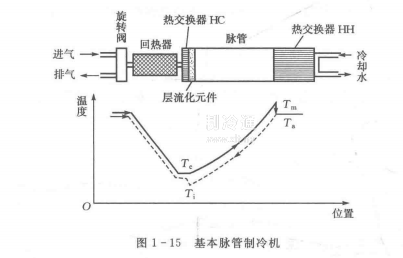 制冷機由壓縮機、回熱器和脈管單元組成,它們之間用金屬軟管連接。壓縮機作為壓力波發生器。脈管單元是一根兩端裝有熱交換器(圖中的HC和HH)的管子,管內有層流化元件防止氣體流混合。