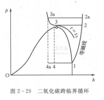 二氧化碳對環境友好,是第四代制冷劑中重要的一員。但受其臨界溫度的限制,無法在一些制冷裝置,如汽車空調器或家用熱水器中采用常規的蒸氣壓縮式循環。為此,開發了CO?,跨臨界循環。循環如圖2-29所示,12為等熵壓縮過程,23為等壓冷卻過程,34為絕熱節流過程,41為吸熱過程。