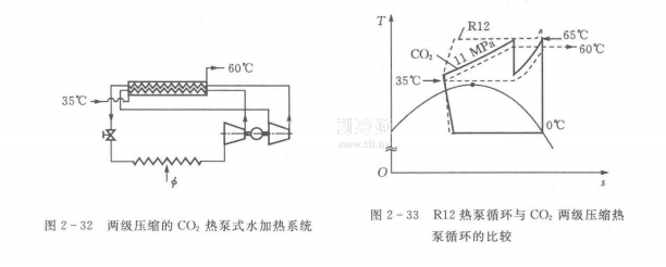 當要求加熱水溫升較小時,上述系統的CO2:的排熱溫度曲線與被加熱流體的吸熱溫度曲線匹配不理想,存在COPH:下降的問題。用分級壓縮可以解決該問題。通過分級壓縮,讓CO2的排熱溫度曲線與期望的形狀相接近。圖2-32示出一個兩級壓縮的CO2熱泵式水加熱系統。將水的溫度從35℃加熱到60℃,適用于溫帶地區冬季供暖裝置。圖2-33利用T-s圖給出在同樣制熱能力和加熱溫度要求下,傳統R12熱泵循環與CO2兩級壓縮熱泵循環的比較。顯然,由于熱交換的溫度匹配關系改善了,CO2系統的能效明顯優于傳統系統。