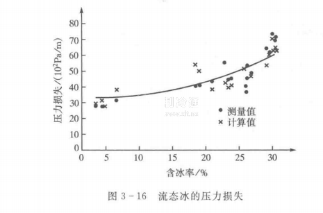 當(dāng)流態(tài)冰的含冰率在5%~27%范圍內(nèi),流速為1m/s,管徑為22mm時(shí),其壓力損失隨含冰率的變化見圖3-16。