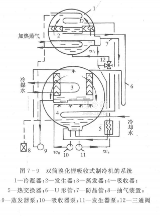 (1)發生器中產生的冷劑蒸氣在冷凝器中冷凝成冷劑水,經U形管進入蒸發器,在低壓下蒸發,產生制冷效應。這些過程與蒸氣壓縮式制冷循環在冷凝器,節流閥和蒸發器中產生的過程完全相同;