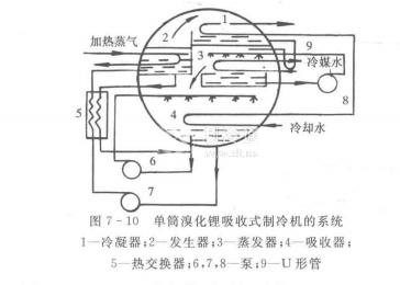 工作原理與循環溶液的蒸氣壓力是對平衡狀態而言的。如果蒸氣壓力為0.85kP的溴化鋰溶液與具有1kP壓力(7℃)的水蒸氣接觸,蒸氣和液體不處于平衡狀態,此時溶液具有吸收水蒸氣的能力,直到水蒸氣的壓力降低到稍高于0.85kPa(例如:0,87kPa)為止。0.87kPa和0.85kPa之間的壓差用于克服連接管道中的流動阻力以及由于過程偏離平衡狀態而產生的壓差,如圖7一7所示。水在5℃下蒸發時,就可能從較高溫度的被冷卻介質中吸收汽化熱,使被冷卻介質冷卻。為了使水在低壓下不斷汽化,并使所產生的蒸氣被吸收,從而保證吸收過程的進行,供吸收用的溶液的濃度必須大于吸收終了的溶液的濃度。為此,除了必須不斯地供給蒸發器純水外,還必須不斷地供給新的濃溶液,如圖7一7所示。顯然,這樣做是不經濟的。