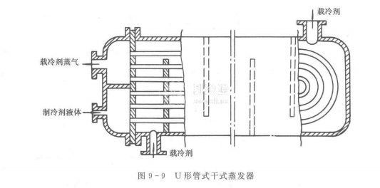 折流板用拉桿固定,相鄰兩塊折流板之間裝有定距管,以保證折流板的間距。U形管式干式蒸發器如圖9-9所示。這種蒸發器的殼體,折流板以及載冷劑在殼側的流動方式和直管式干式蒸發器相同。兩者的不同之處在于U形管式是由許多根不同彎曲半徑的U形管組成。U形管的開口端脹接在管板上,制冷劑液體從U形管的下部進人,蒸氣從上部引出。U形管組可預先裝配,而且可以抽出來清除管外的污垢。此外,還可消除傳熱管熱脹冷縮所造成的內應力。制冷劑在流動過程中始終沿同一管道內流動,分配比較均勻,不會出現多流程的氣、液分層現象,因而傳熱效果較好。其缺點是:由于每根傳熱管的彎曲半徑不同,制造時需采用不同的加工模具:不能采用縱向內肋片管,當管組的管子損壞時不易更換。
