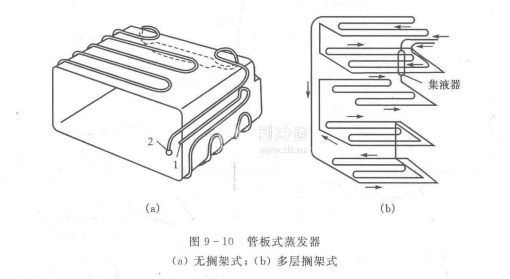 ①管板式。管板式蒸發器有兩種典型結構,見圖9-10和圖9-11.圖9-10(a)示出的無擱架式蒸發器是將直徑為6~8mm的紫銅管貼焊在鋁板或薄鋼板制成的方盒上,這種蒸發器制造工藝簡單,不易損壞泄漏,常用于冰箱的冷凍室。在立式冷凍箱中,此類蒸發器常做成多層擱架式,將蒸發器兼作擱架,如圖9-10(b)所示,具有結構緊湊,冷凍效果好等優點。