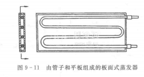 圖9-11是另一種管板式蒸發器結構,管子裝在兩塊四邊相互焊接的金屬板之間,管子和金屬板之間充填共晶鹽溶液并抽真空,使金屬板在大氣壓力的作用下,緊壓在管子外壁,保證管和板的良好接觸。充填的共晶鹽溶液用于儲蓄冷量。這種蒸發器常用作冷藏車的頂板及側板,也可用作冷凍食品的陳列貨架。