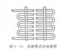 ③冷卻排管。冷卻排管主要應用于低溫實驗箱及冷庫的冷藏庫房中。圖9-13所示為光滑管式冷卻排管,這種蒸發器的結構簡單,是一組沿天花板或墻壁安裝的光滑管組。制冷劑從管組的一端進入,蒸氣從另一瑞排出。氨制冷機使用的光滑管是無縫鋼管,氟里昂制冷機用的光滑管是紫銅管。為了提高傳熱效率,也有采用肋片管的。