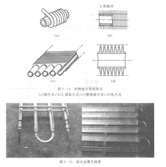 肋片管式蒸發器是在光滑管上套上金屬片(整體套片式)或繞金屬帶(繞片式)后制成的。由于肋片的作用,提高了蒸發器外側的傳熱效果,肋片應和管壁接觸良好,以保證良好的導熱性能。對于換熱管為鋼管的蒸發器,肋片多采用繞片式,即用薄鋼帶繞在鋼管外側,并點焊固定而成:對于換熱管為銅管的蒸發器,肋片則采用整體套片式或L型肋片,即將整張的鋁箔肋片沖出很多管孔,然后換熱管從管孔中穿過,可以使用高壓流體或機械方法將管經擴張:隨著鋁制品的應用和機械加工技術的進步,也有采用鋁管整體軋制的肋片,圖9一14示出了四種肋片管的形式。