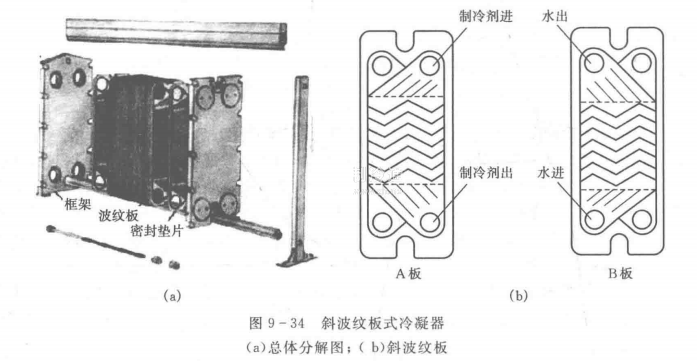 波紋板式冷凝器是由一系列具有一定波紋形狀的金屬片疊裝而成的一種新型高效換熱器。圖9-34()為波紋板式冷凝器的總體分解圖。波紋薄板分A板和B板兩種(如圖9-34(b)所示),交替疊裝,四周通過墊片密封,并用框架和壓緊螺旋重疊壓緊而成。板片和墊片的四個角孔形成了流體的分配管和匯集管,同時又合理地將制冷劑和冷卻水分開,使其分別在每塊板片兩側的流道中流動,通過板片進行熱交換。流體的速度和方向不斷地發生突變,激起流體的強烈擾動,破壞邊界層,減少液膜熱阻,從而強化了傳熱效果。板片大都用沖壓法制成各種形狀,如平直紋板片、人字形板片、斜波紋板片等。