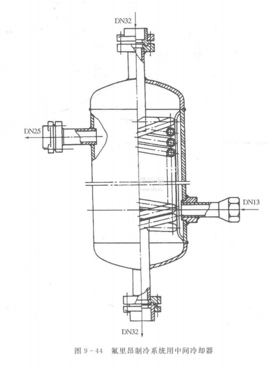 2.氟里昂制冷系統用中間冷卻器兩級壓縮氟里昂制冷系統多采用一級節流不完全冷卻循環,中間冷卻器僅用來冷卻高壓液體,故結構比較簡單,多做成殼盤管式,如圖9一44所示。