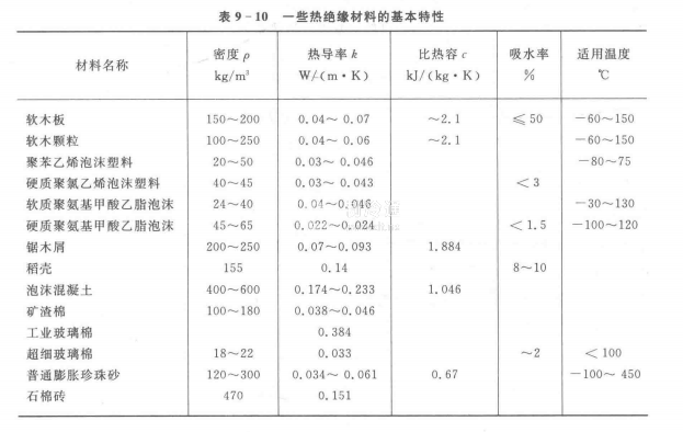 可用于制冷裝置的絕熱材料很多,按其組織結構分為纖維材料、多孔性材料及顆粒狀材料;按其性質分為有機質材料及礦物質材料等。表9-10給出了一些常用絕緣材料的基本特性。一般說來,有機質絕緣材料的優點是密度小(一般在300kg/以下),熱導率小(一般在