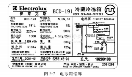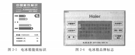 (3)看銘牌。圖2-7所示為某電冰箱的品牌。通過查看銘牌可以具體了解電冰箱的一些性能指標,為決定是否購買這款電冰箱提供決策依據。