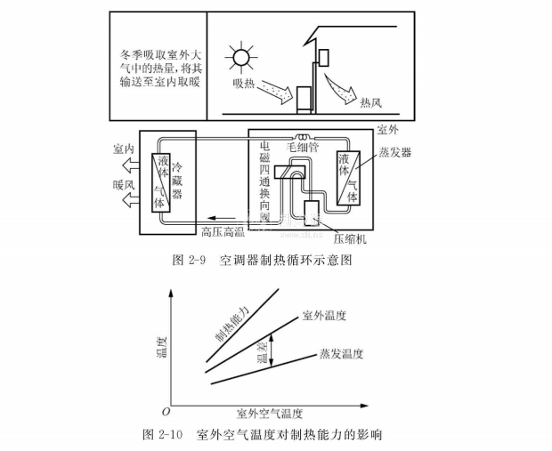 也就是說,隨著室外溫度的降低,空調(diào)器的制熱能力減弱。室外空氣溫度對制熱能力的影響如圖2-10所示。目前,一些空調(diào)器生產(chǎn)廠家的產(chǎn)品在室外溫度為一8℃時(shí)仍能工作,但制熱效果較差。一般當(dāng)環(huán)境溫度低于5℃時(shí),就要考慮使用輔助設(shè)備,如輔助電加熱器等。盡管熱泵型空調(diào)器的制熱能力受環(huán)境的影響較大,但是因?yàn)槠渲茻崮芰κ请娕鞯?/span>3倍左右,非常經(jīng)濟(jì)、安全、清潔,符合環(huán)保要求。因此,采用熱泵型空調(diào)器取暖非常普遍。