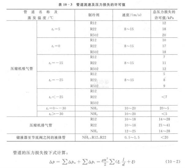 在設計制冷系統時,管道內徑是根據管內流體流動的速度及管道總壓力損失的許可值計算的。表10-3中列出了幾種制冷劑的常用流速及總壓力損失的許可值,這些許可值對于吸氣管來說相當于飽和溫度降低了1℃,對于排氣管相當于飽和溫度升高了1一2℃。