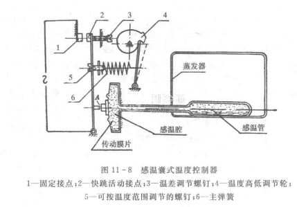 (1)機械式蒸氣壓力溫控器感溫囊式溫控器在家用冰箱中應用較多,其工作原理如圖11-8所示,