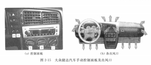 如圖2-15所示為大眾捷達汽車手動控制面板及各出風口。對于不同類型的汽車空調,人工控制面板的控制鍵和形式有所不同,但其功能鍵的控制內容基本相同。下面以大眾捷達汽車的控制面板為例進行說明。