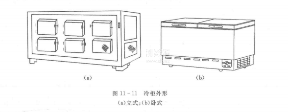 冷柜的外型如圖11-11所示,可分為立式和臥式兩種。由于冷柜容積較大,存放物品多,箱體負(fù)荷較大,因此一般都用角鋼或鋼板焊接成箱架。箱體外殼為薄鋼板,并經(jīng)防銹涂漆處理。內(nèi)側(cè)采用鍍鋅鋼板,中間填充絕熱性能良好的保溫材料。