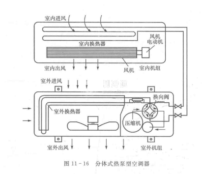 (2)制冷劑循環系統由于空調器作制冷運行和供熱運行時,壓縮機的壓力比和制冷劑的流量變化很大,因而制冷運行所需的毛細管長度與供熱運行所需的毛細管長度相差很大,為此采用雙毛細管系統,見圖11-17.供熱時,制冷劑先經過副毛細管再經過主毛細管;制冷時,制冷劑只經過主毛細管。與熱泵型窗式空調器相同,分體式熱泵空調器也用四通換向閥轉換制冷循環和供熱循環。