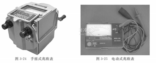 手搖式兆歐表(圖3-24)的電源為手搖發電機,測量機構為磁電式流比計。它的優點是比較方便,但缺點是輸出電壓難以保證。
