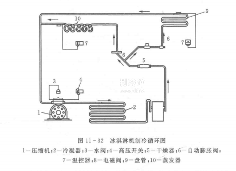 冰淇淋機由制冷系統、攪拌系統、進出料和控制系統等組成。制冷系統由壓縮機、冷凝器、膨脹閥或毛細管、蒸發器等組成,如圖11-32所示。冰淇淋機的蒸發器通常制成圓簡形,即為裝置的冷凍缸,用不銹鋼材料制成,臥式安置。通常制成內外壁夾套式,內腔冷卻冰淇淋物料,內外壁之間用于制冷劑液體蒸發,并有螺旋導向板引導制冷劑流動。也有在冷凍缸外壁上盤繞銅管組成蒸發器的無論使用哪種形式,均需在蒸發器外用聚氨酯塑料泡沫成形發泡隔熱。