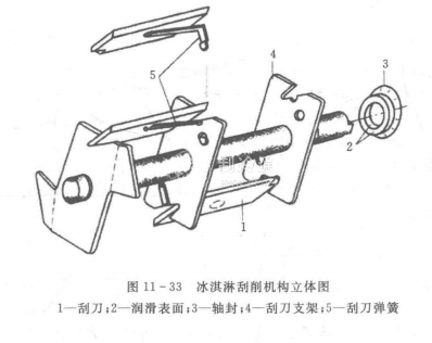 帶預冷缸的冰淇淋機需要引導制冷劑液體流經預冷缸外壁蒸發。攪拌作用使一部分空氣進人冰淇淋,二氧化碳和空氣的膨脹作用有利于冰淇淋的擠出過程。刮刀清洗之后,必須放歸原處,刮刀之間不可互換,否則不利于冰淇淋機的穩定運行。圖11-33為刮削機構的立體圖。